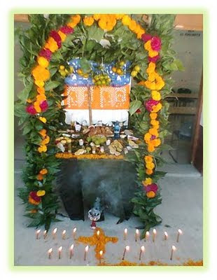¡El altar ya está terminado! Las hojas de palmilla lo revisten; son de un verde intenso, oscuro, brillante, las flores alfombran en ramos el cielo y también los pilares. De entre las hojas cuelgan las naranjas, mandarinas, limas. Todas ellas como si salieran de las ramas. Sobre la mesa están las veladoras con su luz de cobre y los alimentos que saboreaban en vida los difuntos. Para mi abuelo dulce de calabaza, terrones de panela para una tía, ¡y a mi hermana lupitas que es su fruta de monte preferida! Una se la abrí y la otra no, para que se la llevara. ¡La estaré esperando!