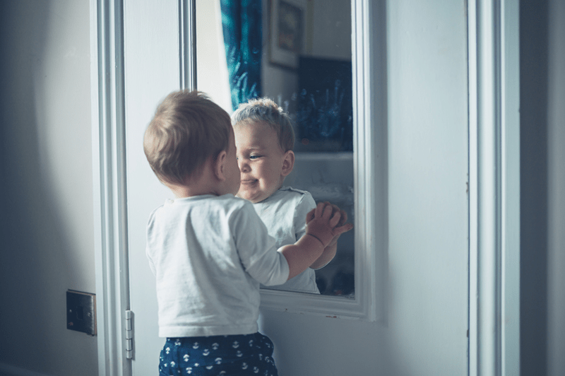 El bebé vio a otro bebé. Arrojó la sonaja al intruso y el intruso hizo lo mismo. Lloró con espanto y a toda prisa regresó buscando los brazos de su mamá. El otro se sonrió y despues se hizo humo por la ventana del espejo.