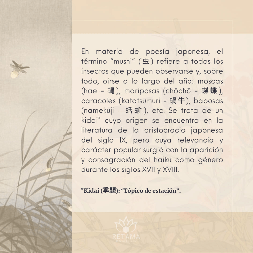 Tal vez, por eso, de las casi 5 000 «palabras de estación» (kigo – 季語) existentes en el mundo del haiku, casi un tercio de ellas se encuentran vinculadas al mundo de los insectos (mushi – 虫) ![]()